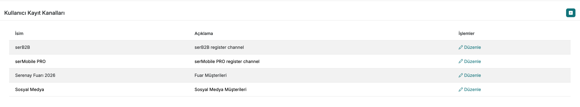 Kullanıcı Kayıt Kanalları özelliği ile kendi kanallarınızı tanımlayabilirsiniz: Serenay Fuarı 2026, Sosyal Medya gibi. Yeni müşteri eklerken müşteri detayından ilgili kanalı seçiyorsunuz. Hangi kanalın kaç müşteri getirdiğini net olarak görüp pazarlama bütçenizi artık veriye dayanarak yönetiyorsunuz.