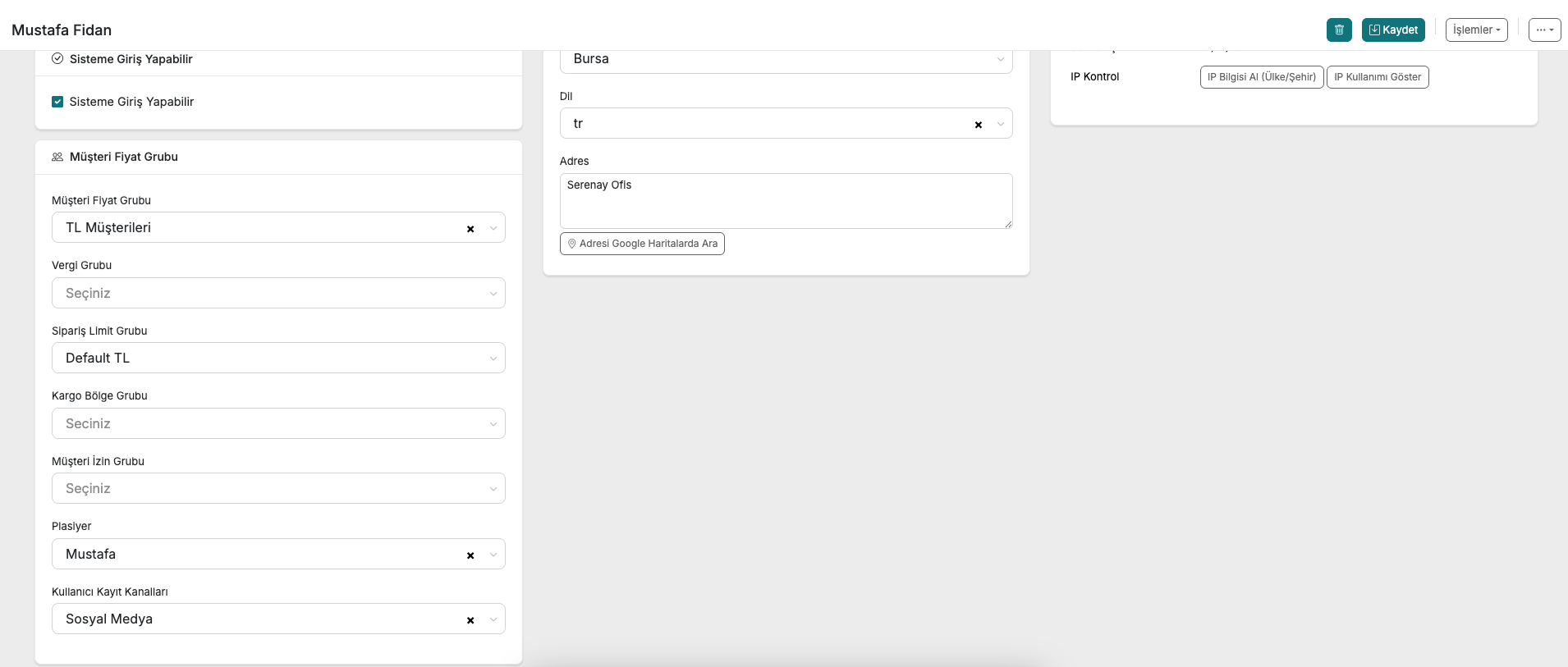 Müşteri detay sayfasında "Kullanıcı Kayıt Kanalları" alanından kanalı seçip "Kaydet" butonuna tıklayın. Böylece o müşterinin hangi kanaldan geldiği sisteme kayıt edilmiş olur.