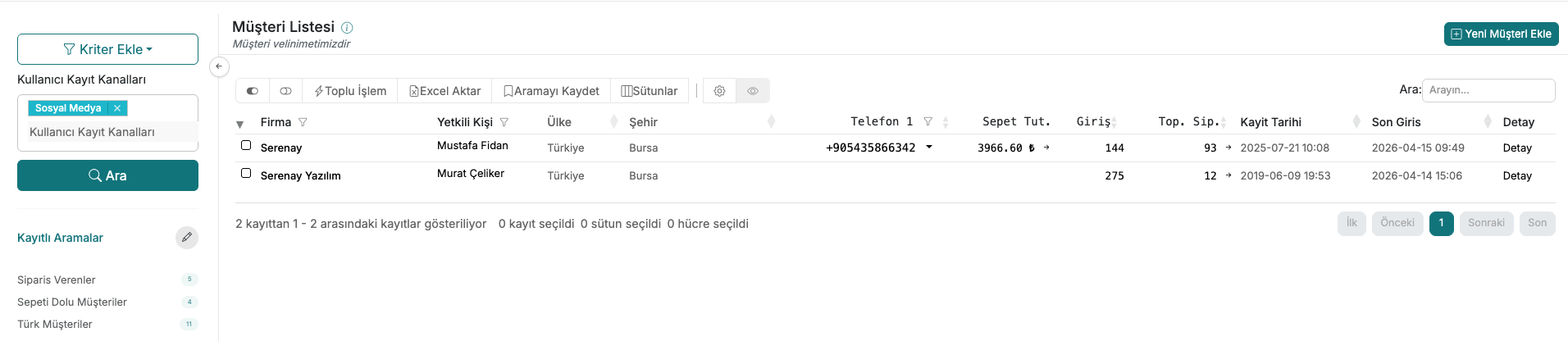 "Kriter Ekle" butonuna tıklayıp "Kullanıcı Kayıt Kanalları" kriterini seçin ve filtrelemek istediğiniz kanalı seçin. Filtreleme sonucunda o kanala ait tüm müşterilerin listesine ulaşabilirsiniz. Örneğin yalnızca Serenay Fuarı 2026'dan gelen müşterileri veya yalnızca Sosyal Medya'dan gelen müşterileri ayrı ayrı görebilirsiniz.
