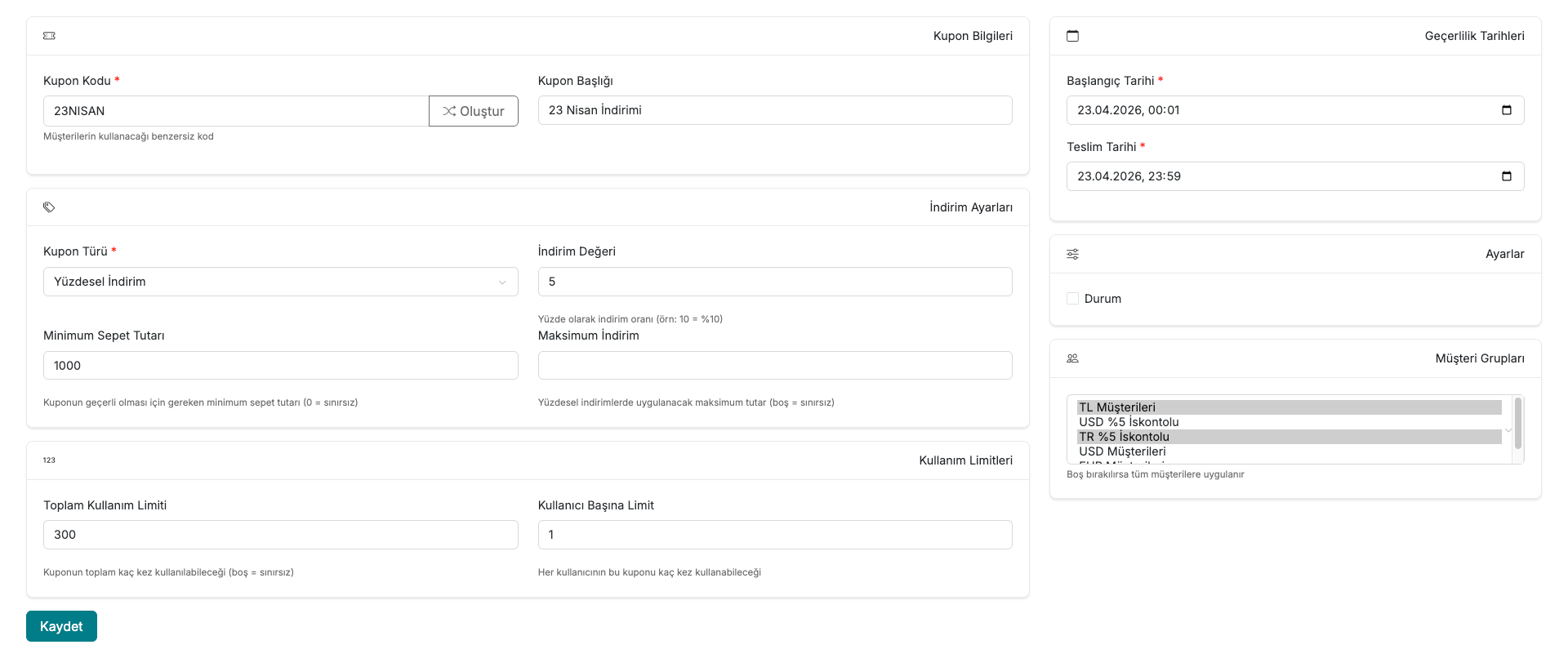 • Teslim Tarihi — Kuponun geçerliliğini yitireceği tarih ve saati girin. (Örn: 23.04.2026, 23:59)