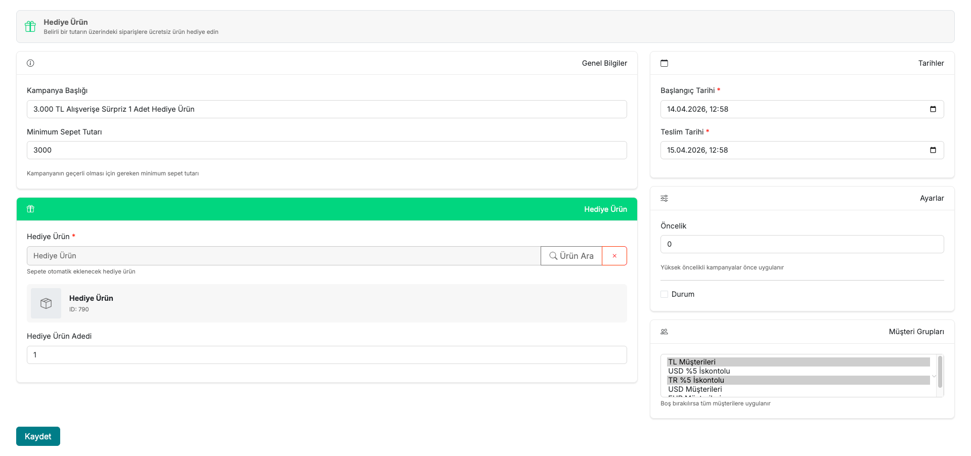 - Hediye Ürün — "Ürün Ara" butonuyla sepete otomatik eklenecek hediye ürünü seçin.