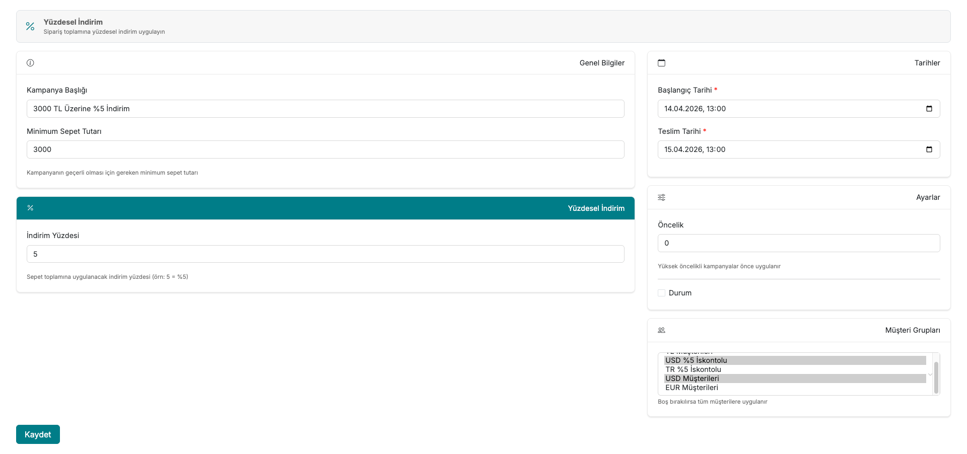 - Kampanya Başlığı — Kampanyanın adını girin. (Örn: 3000 TL Üzerine %5 İndirim)