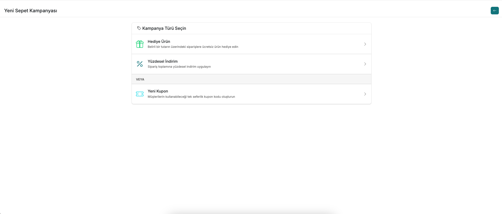Kampanya oluşturmak için sayfadaki "+ Yeni Kampanya Oluştur" butonuna tıklayın. Karşınıza üç farklı kampanya türü çıkar: