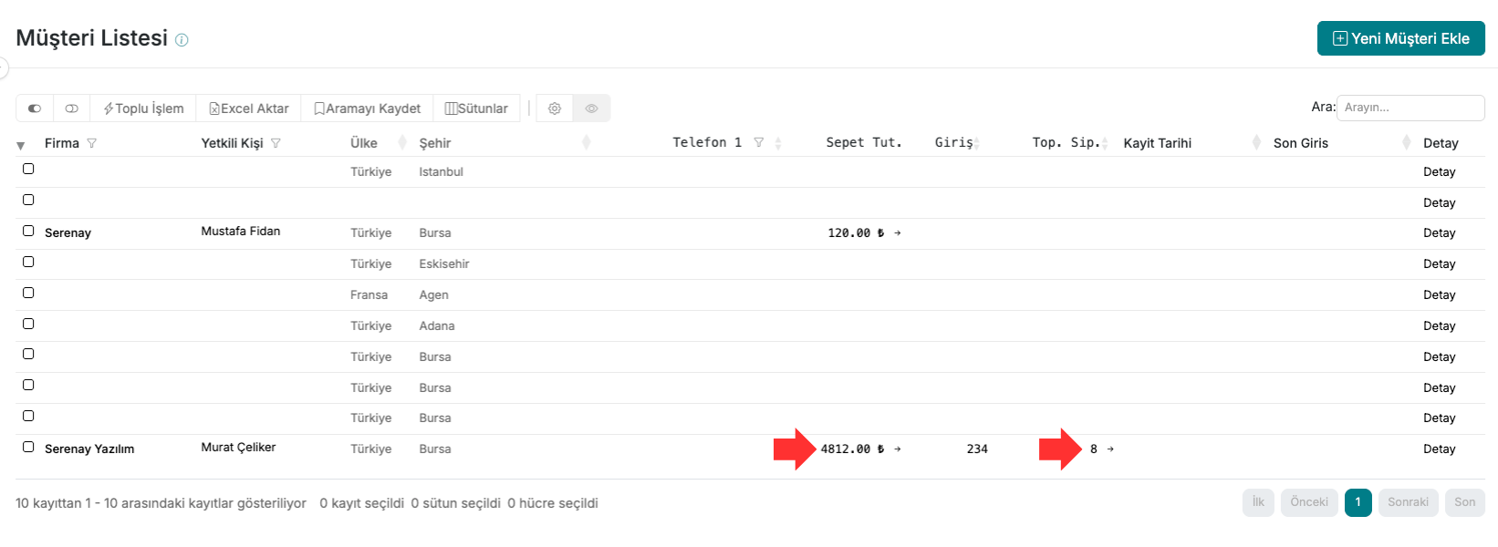 - Toplam Siparişler alanına tıkladığınızda ise, o müşteriye ait tüm siparişlerin listelendiği sayfaya yönlendirilirsiniz.