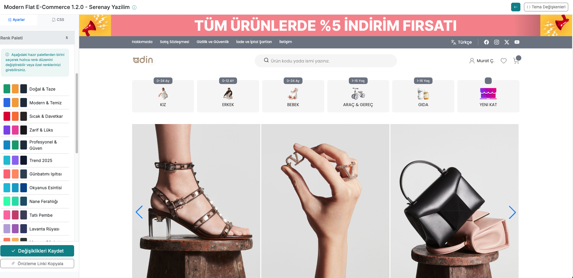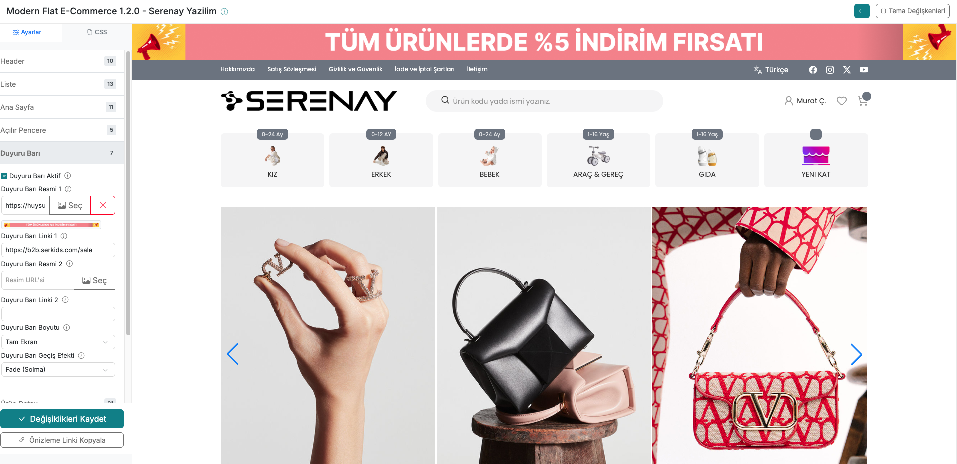 Tema Ayarları modülü, serB2B sisteminin görünümünü ve kullanıcı deneyimini iyileştirecek temel yapı taşlarını yönetmenizi sağlar. serB2B yönetici paneli menüsünden Tasarım > Tema Ayarları bölümüne giderek dokuz farklı sekme (Header, Liste, Ana Sayfa, Popup, Duyuru Barı, Ürün Detay, Genel, Sepet, Renk Paleti) altındaki tüm seçenekleri yapılandırabilirsiniz.