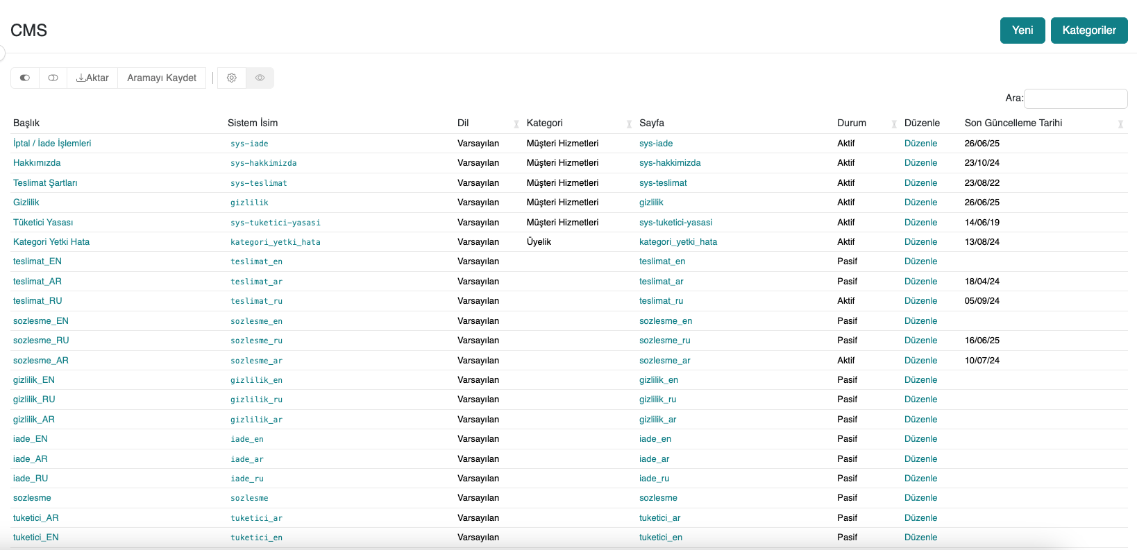 Bu adımlar sayesinde, web sitenizin CMS üzerinden yönetilen statik sayfalarını (örn: Hakkımızda, Gizlilik Politikası, İletişim, İptal / İade Koşulları) birden fazla dilde kolayca sunabilirsiniz.