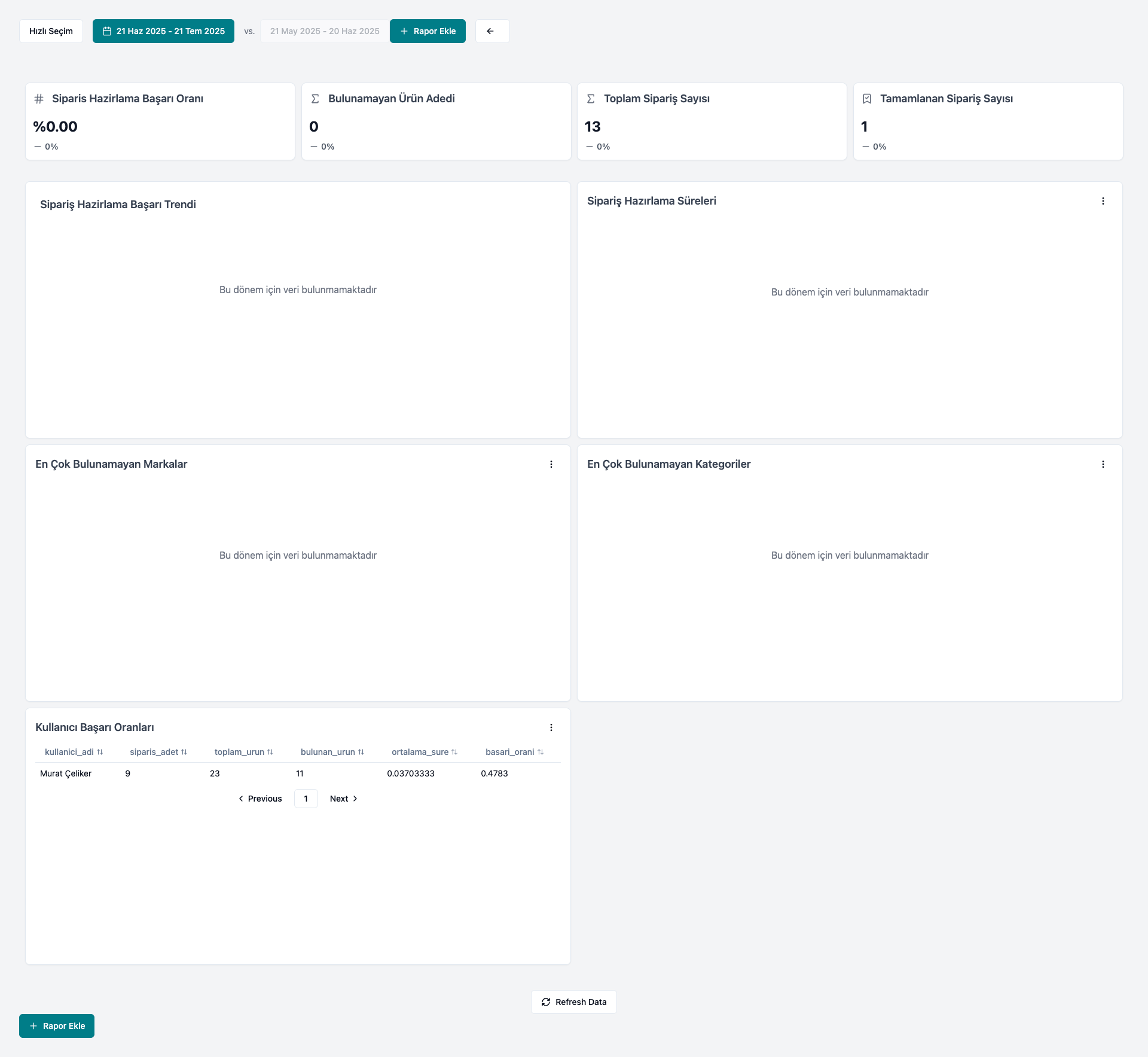 Bu dashboard, işletmenizin sipariş hazırlama süreçlerini proaktif bir şekilde yönetmenizi sağlayacak güçlü bir araçtır. Düzenli olarak bu sayfayı ziyaret ederek operasyonel performansınızı sürekli iyileştirin ve rekabet avantajı elde edin!