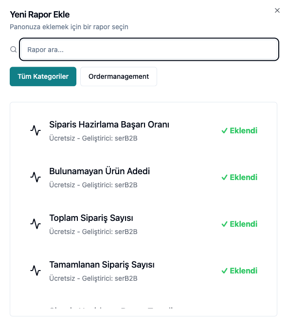 Sayfanın en üstünde yer alan bu kartlar, sipariş hazırlama sürecinizin genel sağlığına dair hızlı bir bakış sunar. Aynı zamanda Rapor Ekle butonuna basarak özelleştirilmiş analiz kartlarına buradan ulaşabilirsiniz.