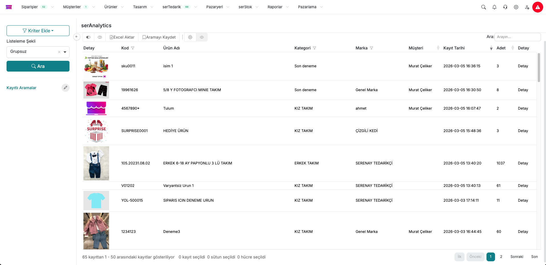 - Kriter Ekle butonu ile kategori, marka, müşteri veya tarih aralığı gibi kriterlere göre filtreleme yapılabilir.