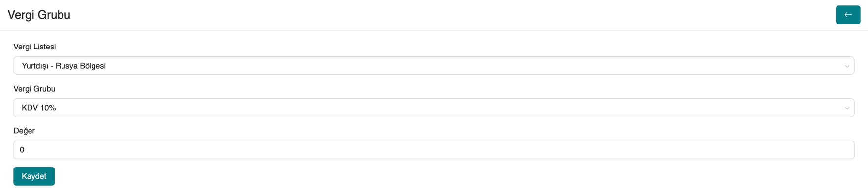 - Vergi Grubu İsmi Tanımlayın: Vergi Grubu için isim tanımlayın. (ör. "Yurtdışı - Rusya Bölgesi").